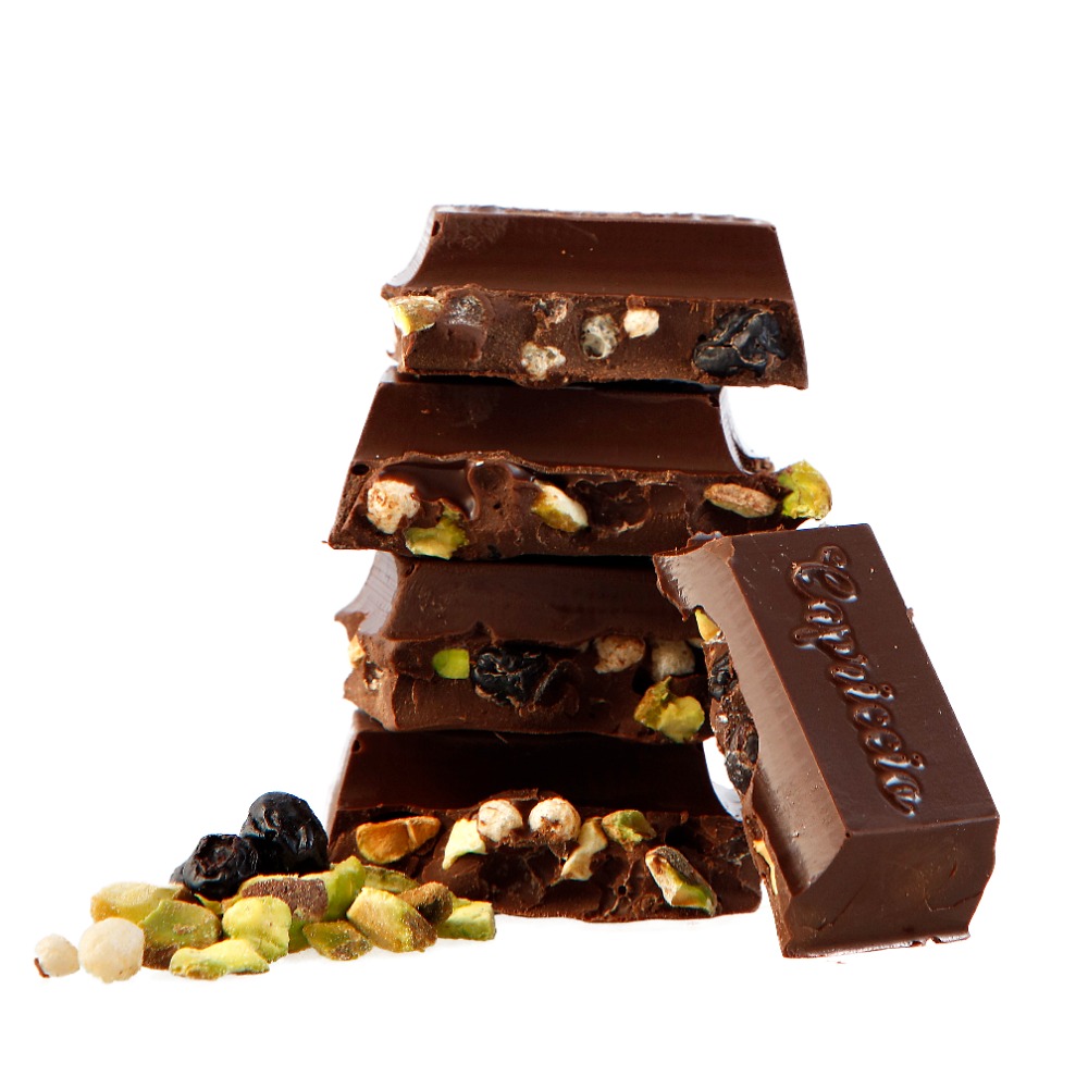 CHOCOLATE OBSCURO + PISTACHE + QUINOA INFLADA + ARÁNDANOS DESHIDRATADOS MEDIDAS: 16.5 X 9 X 1.8 CM PESO: 160 GR