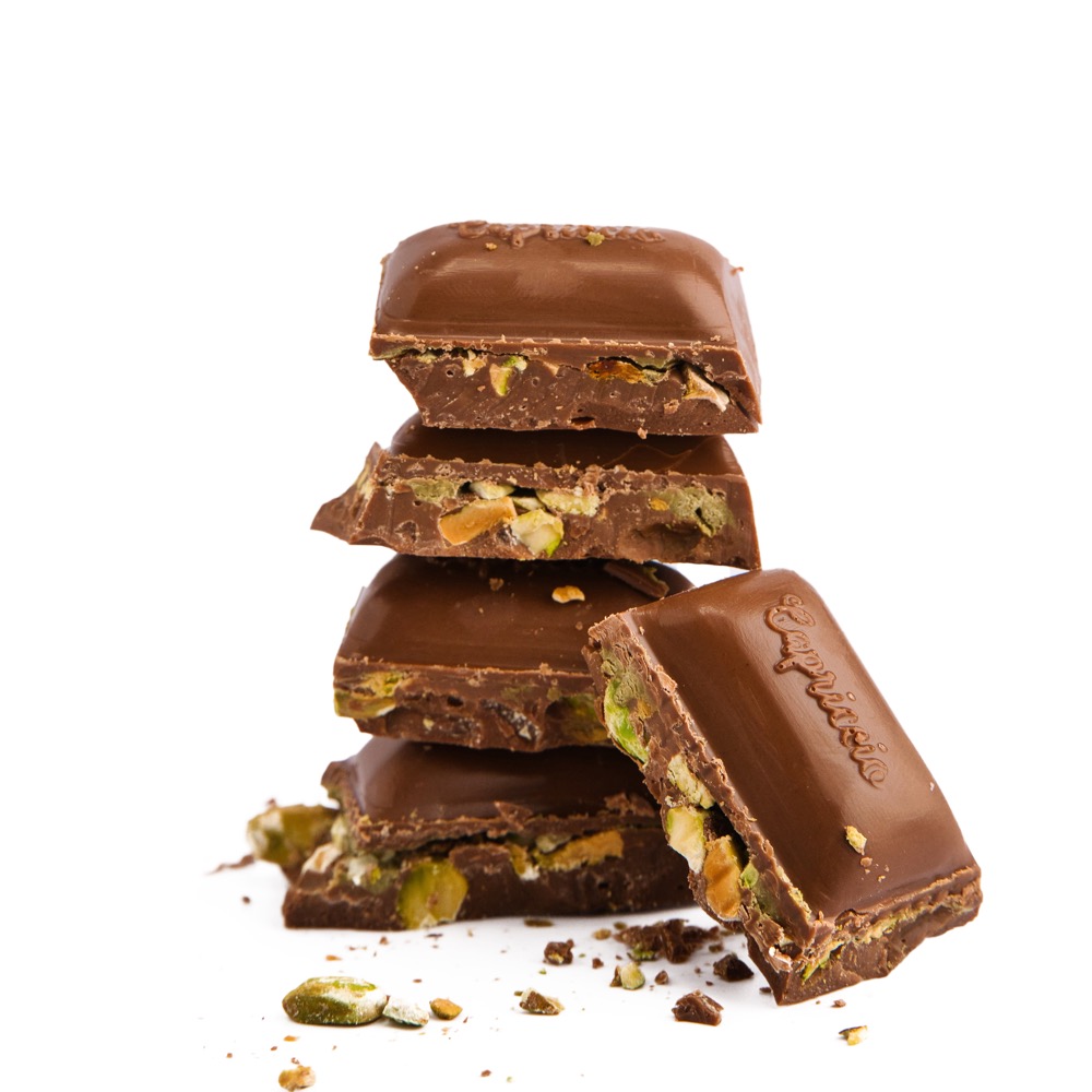 CHOCOLATE DE LECHE RELLENO DE CREMA DE PISTACHE LIQUIDA CON TROZOS DE PISTACHE TOSTADO CON UN TOQUE DE SAL