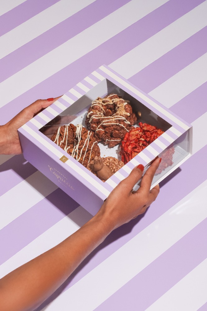CAJA CON 4 MINI ROSCAS , SABORES: MINI ROSCA DE PRALINE (HOJUELAS CON CHOCOLATE Y AVELLANA), MINI ROSCA DE CONEJITO (ARROZ INFLADO CON CHOCOLATE TURIN Y CONEJITO TURIN ENMEDIO), MINI ROSCA DE SMORES (BOMBONES + GALLETA GRAHAM + CHOCOLATE DE LECHE ) Y MINI ROSCA DE SPECULOOS (CEREAL DE CANELA + GALLETA SPECULOOS + CREMA SPECULOOS + CHOCOLATE DE LECHE)