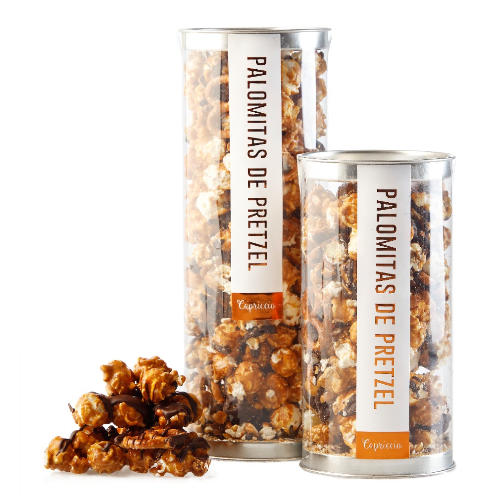 PALOMITAS + CUBIERTAS DE CARAMELO CRUJIENTE + PRETZELS CUBIERTOS DE CHOCOLATE DE LECHE + CHOCOLATE OBSCURO