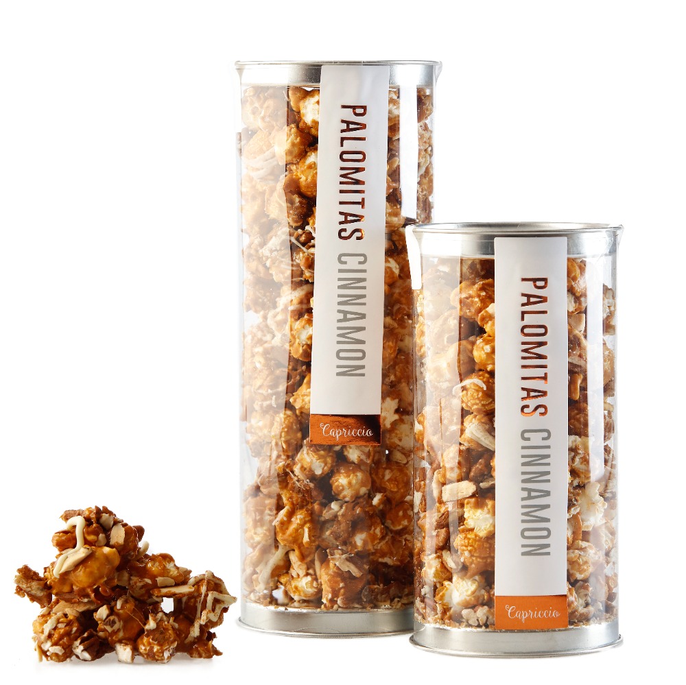 PALOMITAS + CUBIERTAS DE CARAMELO CRUJIENTE + NUEZ PECANA + ALMENDRA TOSTADA CON SAL + CANELA + CHOCOLATE BLANCO